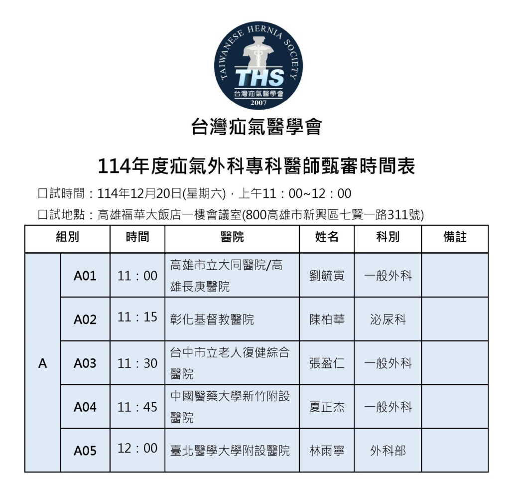 【公告】114年度疝氣外科專科醫師甄審時間表