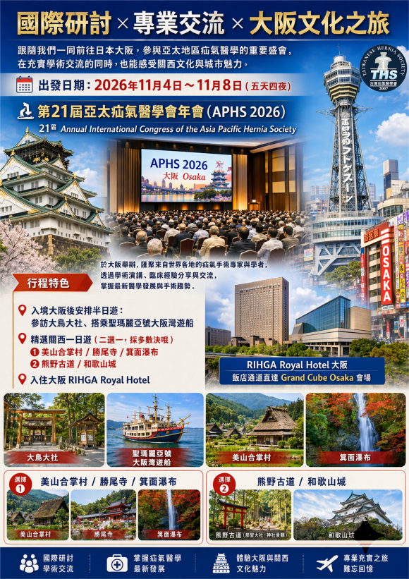 跟隨我們一同前往日本大阪,參與亞太地區疝氣醫學的重要盛會,在充實學術交流的同時,也能感受關西文化與城市魅力。
